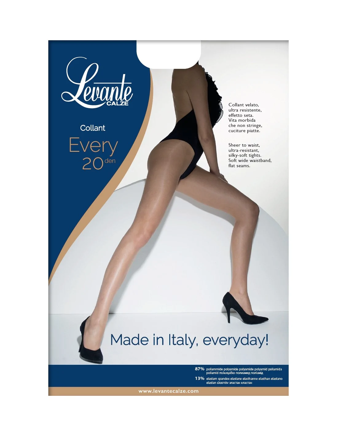 Il Collant EVERY 20 di Levante è un'espressione di eleganza raffinata e duratura resistenza, concepito per esaltare la silhouette con un tocco di prestigiosa leggerezza. Questo collant velato, prodotto con maestria in Italia, è il risultato di un'attenta ricerca di materiali e tecniche innovative. La sua tessitura ultra resistente garantisce una longevità superiore, resistendo alle sfide dell'uso quotidiano senza compromettere l'integrità del filato. L'effetto seta conferisce una lucentezza discreta e una morbidezza ineguagliabile al tatto, avvolgendo le gambe in un velo di comfort sublime. La vita morbida è stata studiata per non lasciare segni e per assicurare una vestibilità impeccabile, mentre le cuciture piatte si rivelano invisibili sotto qualsiasi tipo di abito, garantendo una silhouette fluida e senza interruzioni. Ogni dettaglio è stato curato per offrire un prodotto che si distingue per la sua qualità superiore e la sua capacità di accompagnare con grazia ogni movimento, conferendo un'aura di sicurezza e distinzione.
