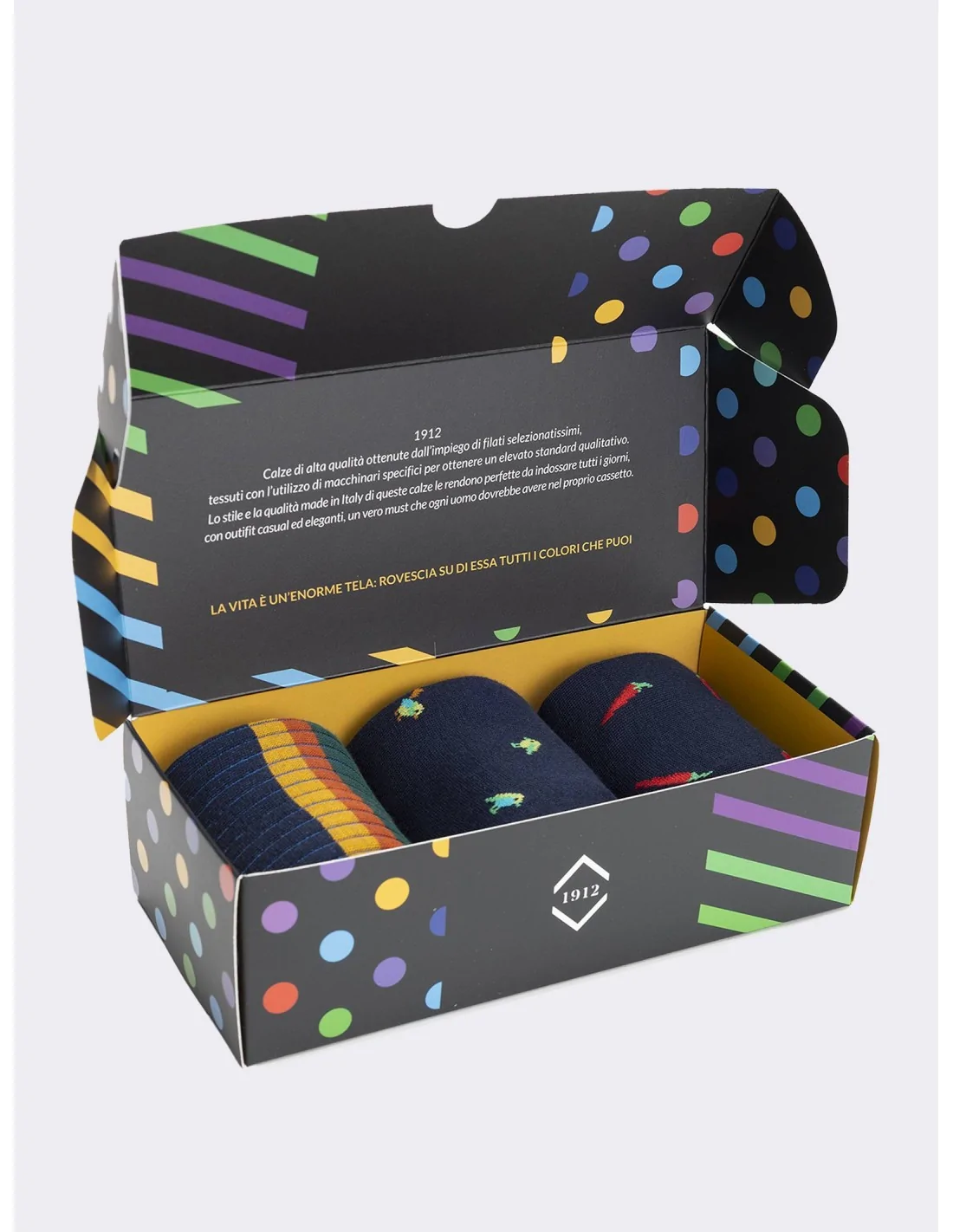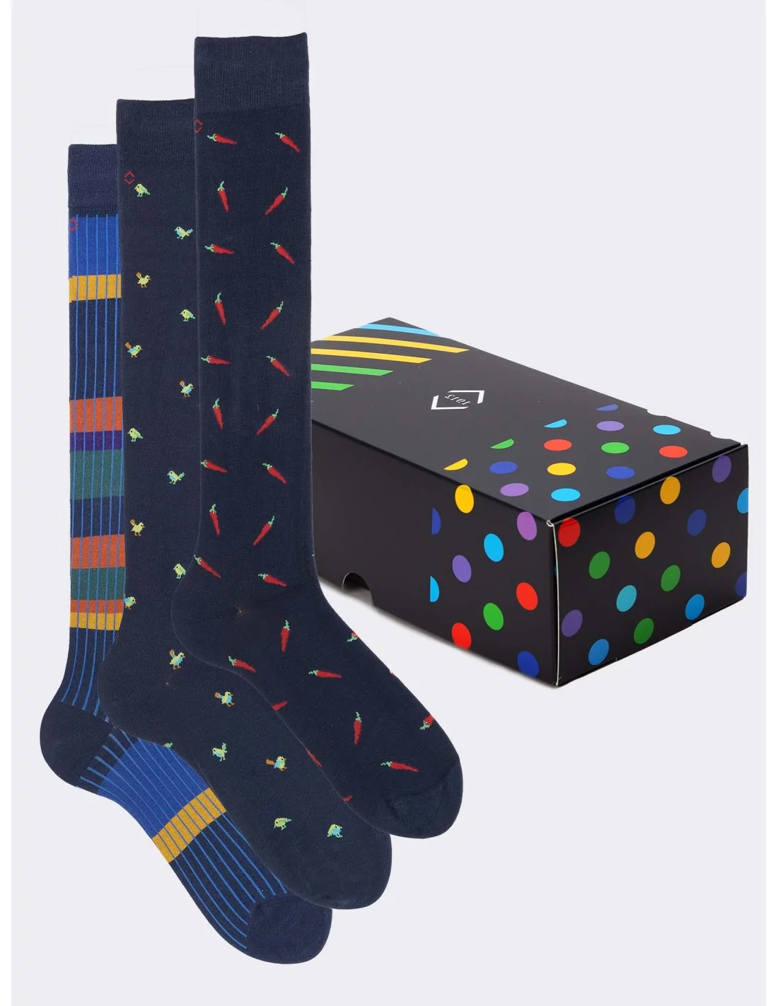 Scopri l'eleganza del Made in Italy con questa raffinata confezione regalo che racchiude tre distintive paia di calze da uomo. Realizzata con pregiato cotone che garantisce comfort e calore durante tutto l'anno, questa selezione esclusiva presenta un assortimento di fantasie sofisticate: un paio con classiche righe, uno con un raffinato motivo di uccelli e un altro con un originale design a peperoncini, tutti su una elegante base blu. Ogni paio è stato meticolosamente realizzato per garantire la massima qualità e durevolezza, rappresentando la perfetta fusione tra stile italiano e comfort quotidiano.